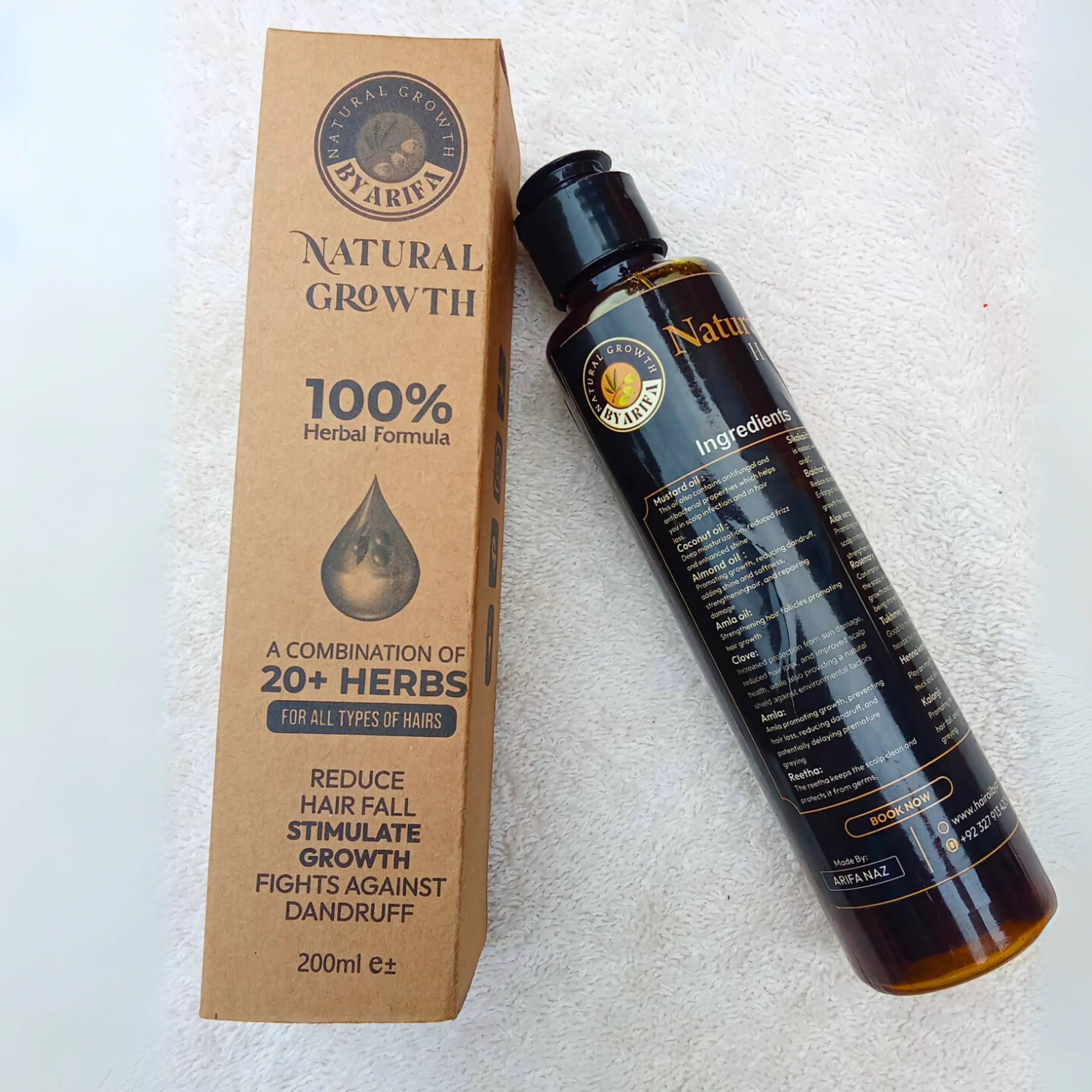 Experience the transformative power of nature with Arifa Naz's Natural Growth Hair Oil. Carefully handcrafted using a powerful blend of herbal ingredients and imported oils, this 100% pure herbal formula nourishes your scalp, strengthens your hair roots, and restores natural shine โ perfect for all hair types.
